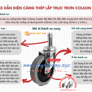 Bánh xe cao su chống tĩnh điện Colson Caster Mỹ có khả năng giải phóng điện tốt, hạn chế tối đa hiện tượng tĩnh điện. Điện trở dẫn điện trung bình theo tiêu chuẩn F-C-88C của Mỹ thấp hơn 0.25x 10^6 ohm ( 250,000 Ohms ), bánh xe lắp trục 22mm x 56mm có chốt bung sử dụng ổ bi lăn nhẹ chịu lực 114kg/ 1 bánh.