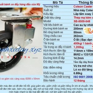 Bánh xe cao su giảm xóc Colson Caster Mỹ dùng để bảo vệ hàng hóa trên xe đẩy, xe kéo hàng khỏi rung sốc khi di chuyển, tiếng ồn giảm nhờ cụm lo xo giảm sốc của bánh xe. Bánh xe cao su 8 inch ( 200mm ) bề rộng bánh xe 2 inch ( 51mm ) có tổng chiều cao 262mm mỗi bánh xe cao su đúc gang chịu lực 400kg, bánh xe đẩy càng thép mạ kẽm xoay 360 độ.