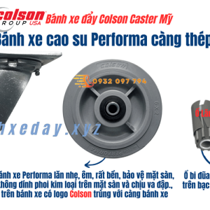 Bánh xe cao su Performa Colson Caster Mỹ, kích thước phi 150mm và 200mm, bề rộng 51mm, càng thép mạ kẽm siêu bền, chịu tải trọng 270kg đến 304kg tùy vào kích thước bánh xe đẩy. Lăn êm, không ồn, bảo vệ sàn nhà.