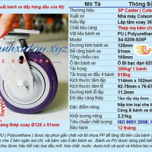 Bánh xe đẩy SP Caster ( Colson Group ) là dòng bánh xe đẩy giá rẻ sản xuất theo hệ thống tiêu chuẩn của ICWM Hoa Kỳ. Bánh xe đẩy dệt sợi chịu lực 306kg/ 1 bánh ráp bộ 4 bánh xe chịu tải 918kg ( xem cách tính tải trọng tại : Hướng dẫn lựa chọn bánh xe đẩy ), kích thước đường kính bánh xe PU phi 125 ( 5in ) bề rộng bánh xe 51mm ( 2in ) có tổng chiều cao 165mm, kiểu bánh xe càng thép mạ kẽm xoay 360 độ. Vật liệu bánh xe PU chịu được hầu hết các loại dầu mỡ, hóa chất, nước, dung môi và acid và không tạo vết trên sàn.