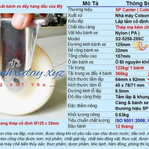 Hãng bánh xe đẩy Colson đảm bảo tất cả bánh xe đẩy giá rẻ SP Cater được sản xuất theo tiêu chuẩn Hoa Kỳ bằng công nghệ tiên tiến đáp ứng đầy đủ các hệ thống tiêu chuẩn chất lượng của ICWM. Bánh xe nhựa PA chịu tải phi 125mm ( 5 inch ) bề rộng bánh xe 32mm ( 1-1/4in ) có có tổng chiều cao 157mm, mỗi bánh xe nhựa Nylon chịu lực 122kg càng bằng thép mạ kẽm cố định. Vật liệu bánh xe PA ( Nylon ) màu trắng lăn nhẹ, chịu nước, hơi nước và không tạo vết trên sàn.