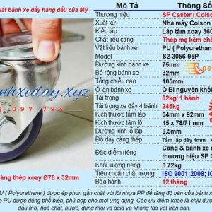 Bánh xe đẩy giá rẻ SP Cater ( Colson Group ) được sản xuất theo tiêu chuẩn Mỹ bằng công nghệ tiên tiến đáp ứng đầy đủ các hệ thống tiêu chuẩn chất lượng của ICWM Hoa Kỳ. Bánh xe PU d75 chủ động càng thép mạ kẽm có bề rộng 32mm tổng chiều cao 105mm, mỗi bánh xe PU chịu lực 82kg xoay 360 độ. Vật liệu bánh xe PU được dùng phổ biến, phù hợp cho mọi ứng dụng.