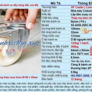 Hãng bánh xe đẩy Colson đảm bảo tất cả bánh xe SP Cater được sản xuất theo tiêu chuẩn Hoa Kỳ bằng công nghệ tiên tiến đáp ứng đầy đủ các hệ thống tiêu chuẩn chất lượng của ICWM. Bánh xe xoay có thắng d100 có có tổng chiều cao 131mm, bánh xe nhựa Nylon chịu lực 122kg cho 1 bánh càng bằng thép mạ kẽm. Vật liệu bánh xe PA ( Nylon ) màu trắng lăn nhẹ, chịu nước, hơi nước và không tạo vết trên sàn.